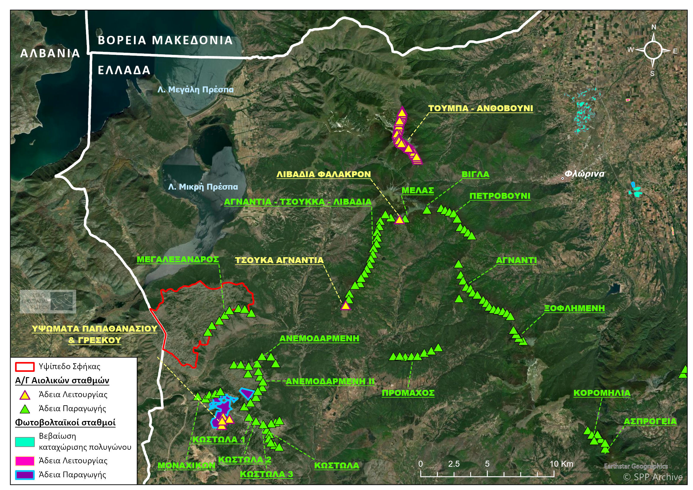 Χάρτης 2: Η σημερινή εικόνα του σχεδιασμού έργων αιολικών και φωτοβολταϊκών σταθμών στην περιοχή μεταξύ Πρέσπας, Φλώρινας και Καστοριάς (τα διαφορετικά χρώματα δηλώνουν διαφορετικά στάδια της αδειοδότησης των έργων). Αθροίζονται συνολικά 155 ανεμογεννήτριες (με Άδεια Παραγωγής: 110, με Άδεια Εγκατάστασης: 5 και με Άδεια Λειτουργίας, δηλαδή ήδη κατασκευασμένες και σε λειτουργία: 40) (πηγή: Geoportal ΡΑΕ).